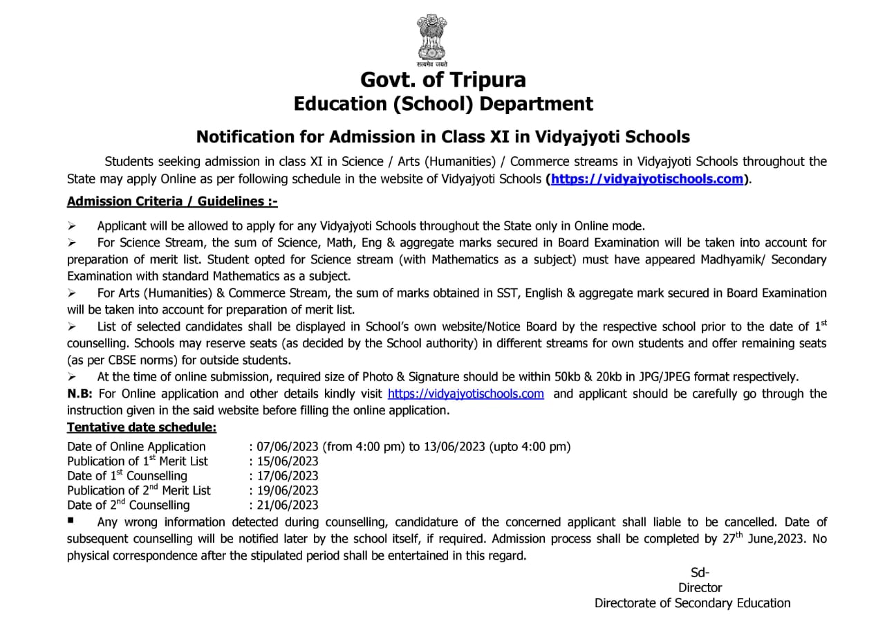 NOTIFICATION REGARDING ADMISSION IN CLASS-XI (2023-24)